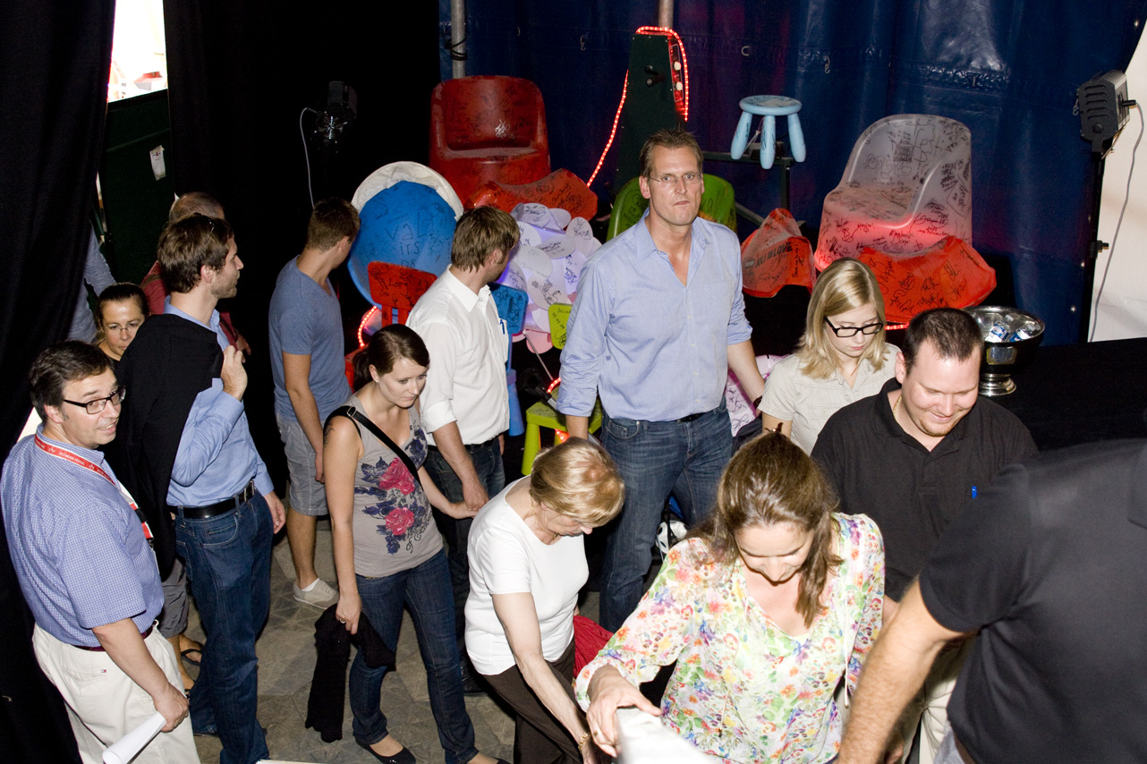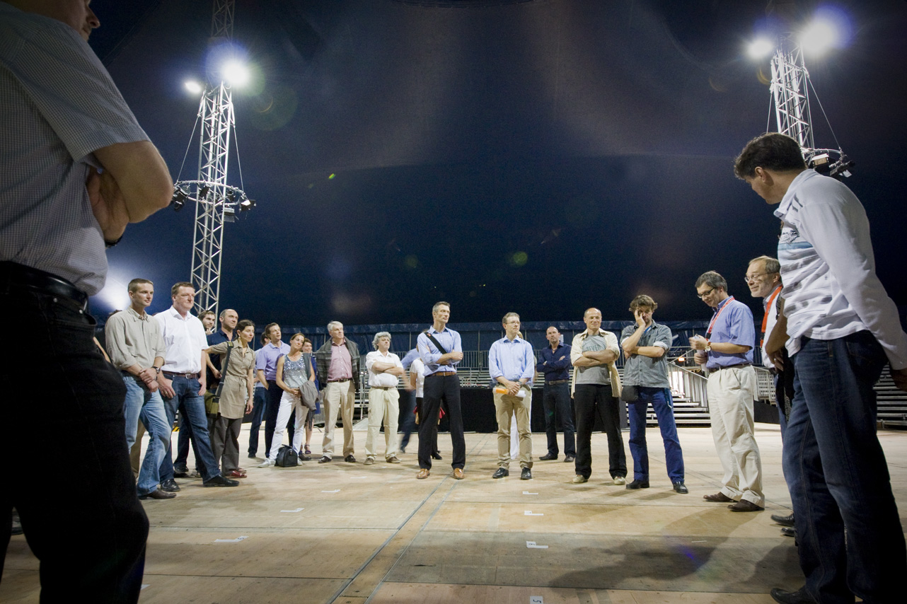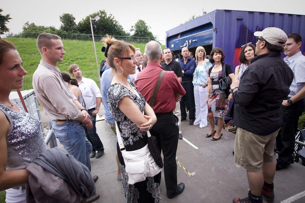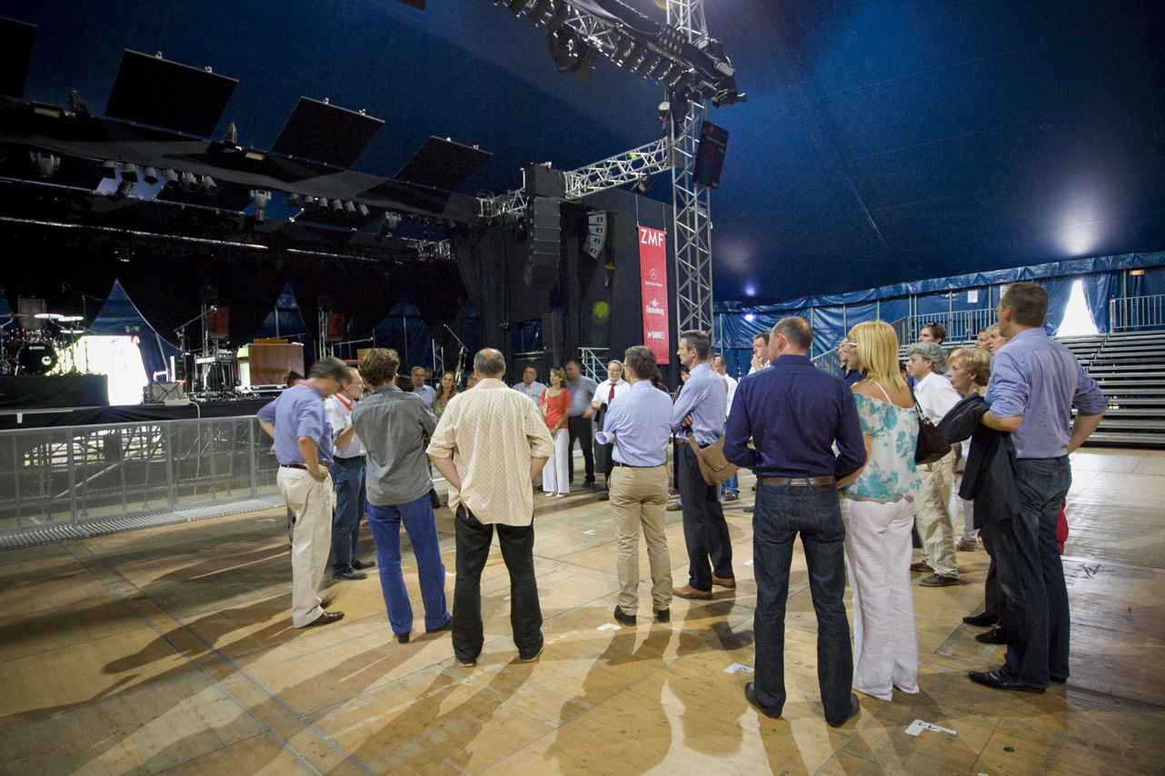 Dieter Pfaff und Andreas Schnitzler führten die beiden Gruppen nach einem Sekt-Empfang in szeniger Atmosphäre des Mercedes-Benz VIP-Bereiches in das Spiegelzelt. Kurz vor Beginn des Konzertes erhielt der Kreis einen Einblick in die technischen Gegebenheiten einer modernen Konzertstruktur. Nach der Führung über die bereits präparierte Bühne ging es in den Backstage Bereich, in dem die Künstler relaxen, zusammensitzen, Essen und sich auf das Konzert vorbereiten. Der Gitarrist von Keb Mo war bereits auf einem flauschigen Leder Sofa am „warmspielen“, während eine Backstage Sängerin in der Hängematte des Green Area entspannte.