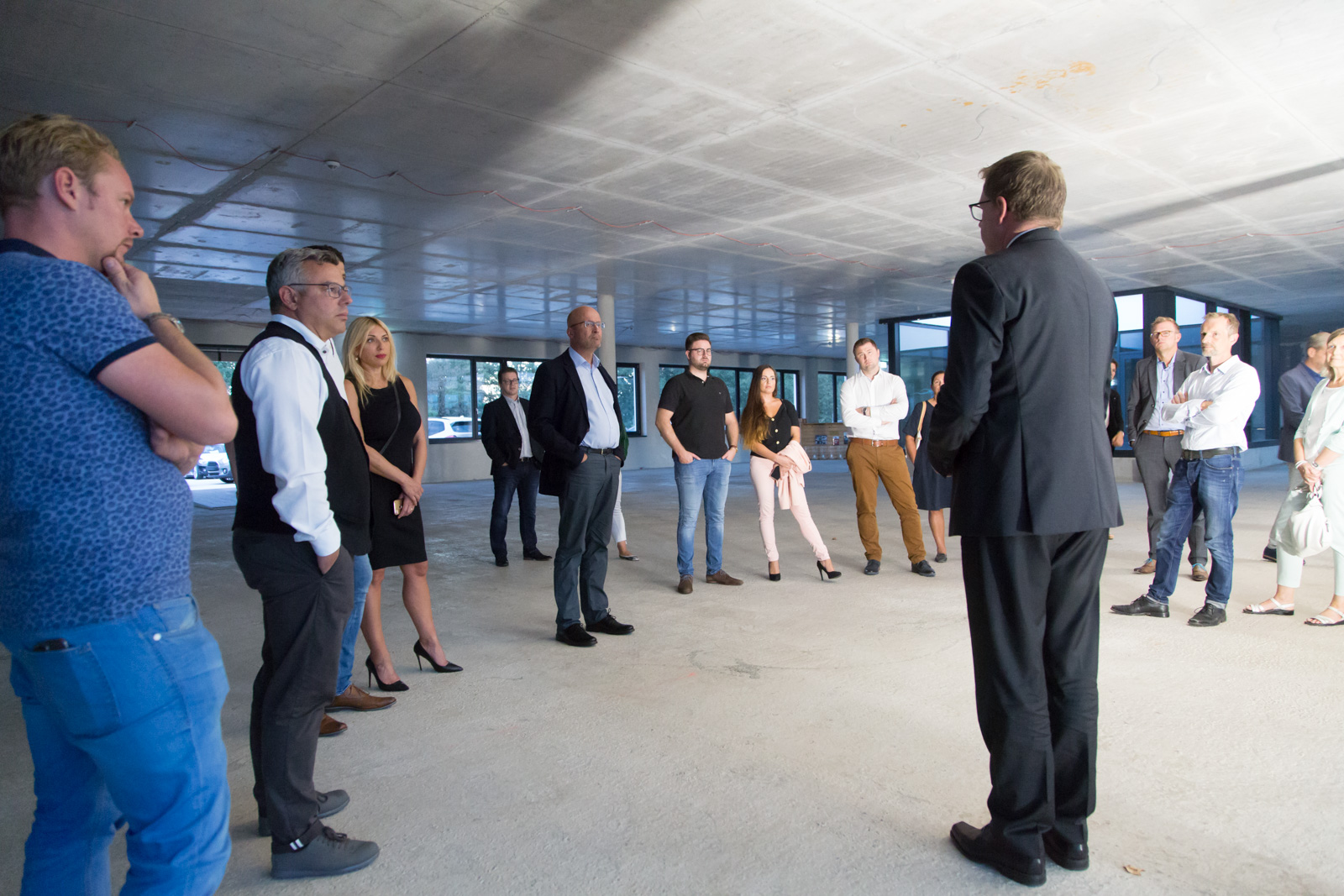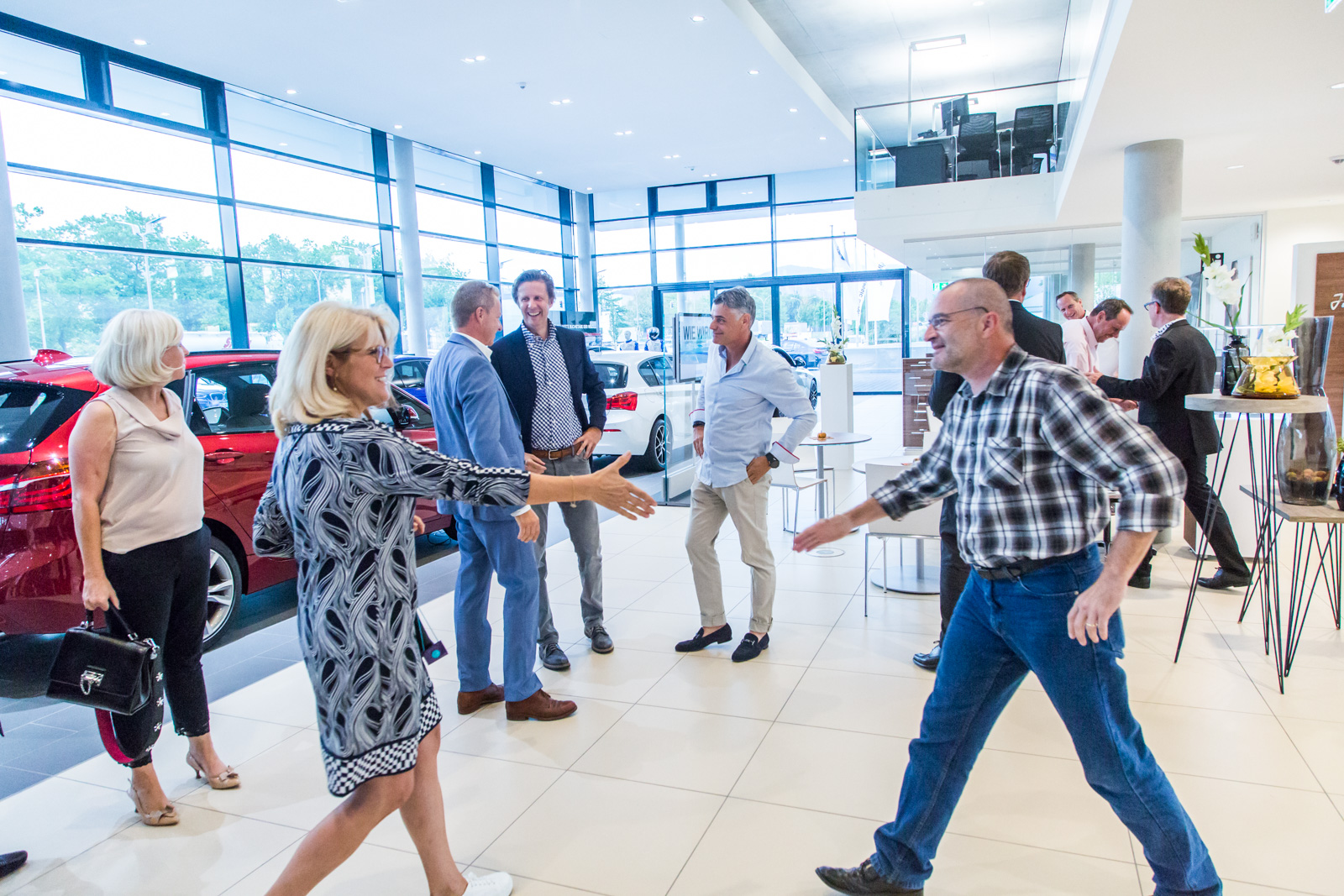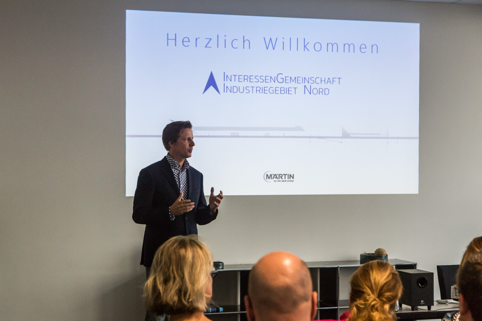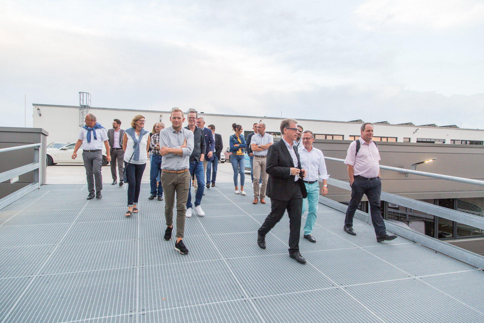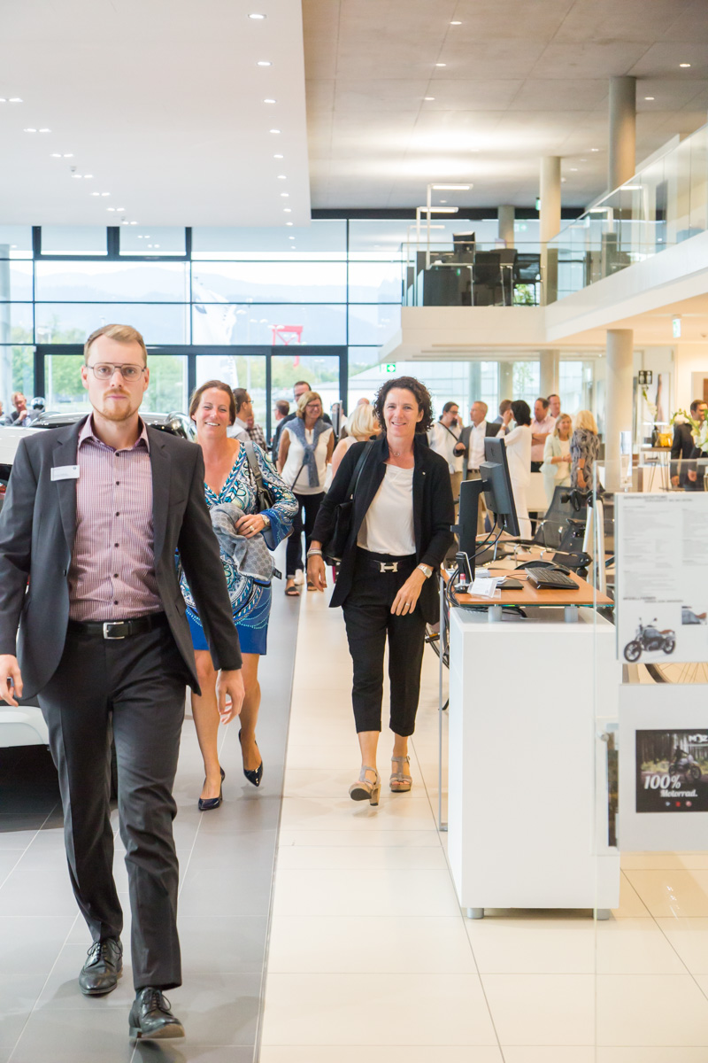 Nach der Begrüßung und den Ausführungen durch den Vorsitzenden der IG Nord und Haid, Christian Schulz wurde klar, dass es ein langwieriger und aufwendiger Prozess war, bis das neue “Multifunktional-Gebäude” von Märtin stand. “Man weiß nicht, wie sich die Mobilität der Zukunft entwickeln wird”, waren sich Hansjörg Märtin und seine beiden Geschäftsführer Dirk Zimmermann und Tobias Gutgesell einig. Daher sei es ihm wichtig gewesen, auf dem 20.000 m² Areal im Norden der Stadt ein besonders wandlungsfähiges Haus zu realisieren. Von der Idee bei einem Workshop mit seinen Führungskräften bis zur Eröffnung vor wenigen Wochen sind mehr als fünf Jahre ins Land gegangen, das BMW und MINI Autohaus verfügt nun über rund 11.000 m² Geschäftsfläche. “Wir sind etwa ein Drittel größer als an unserem alten Standort”, so der Inhaber des Unternehmens nicht ohne Stolz. Alleine die Werkstattfläche sei verdoppelt worden. Als klar gewesen sei, dass seine Mietverträge am alten Standort auslaufen und BMW zudem ein neues, komplett überarbeitetes CI für seine Häuser auflegen würde, das auch Märtin umsetzen musste, sei die Entscheidung für den Umzug und den Neubau nur folgerichtig gewesen.