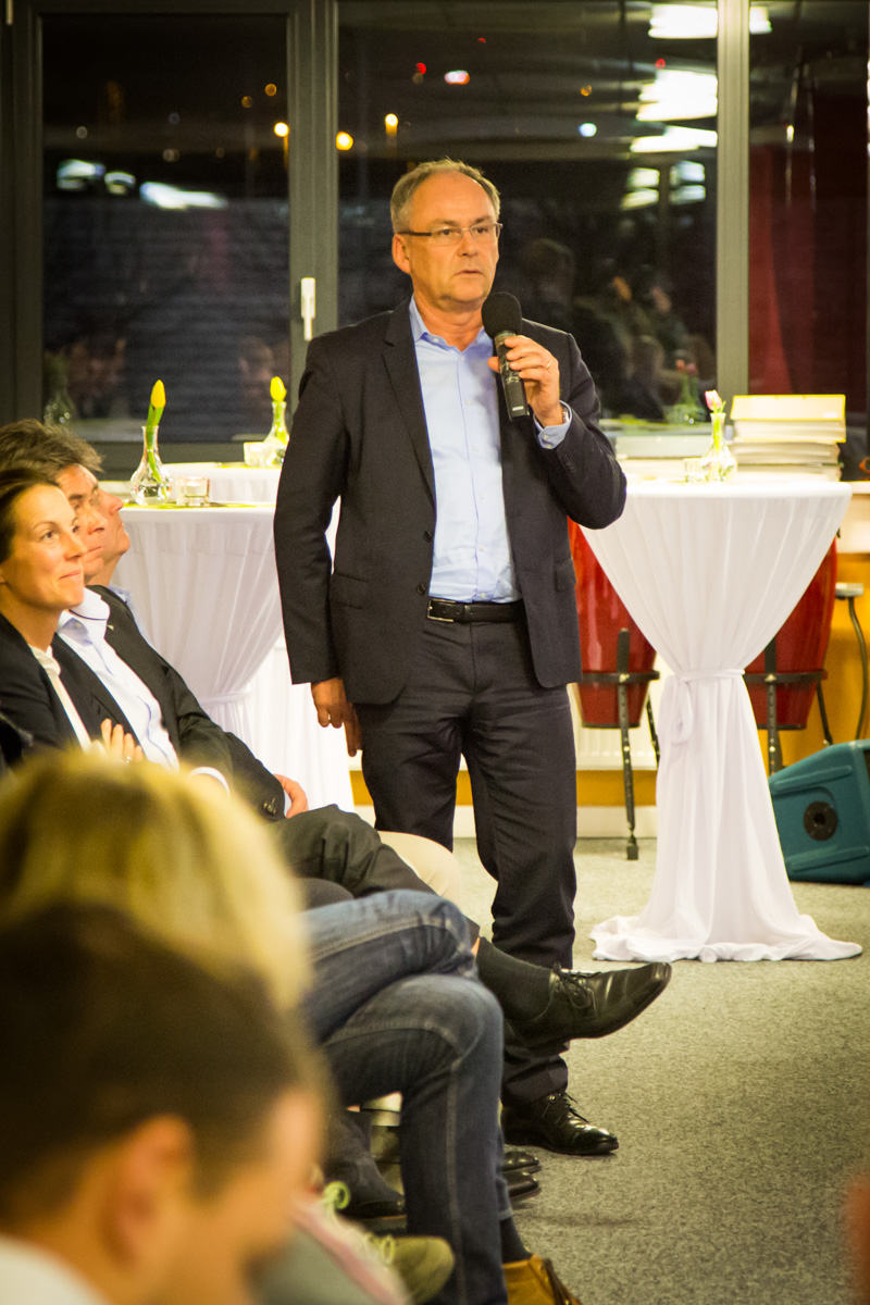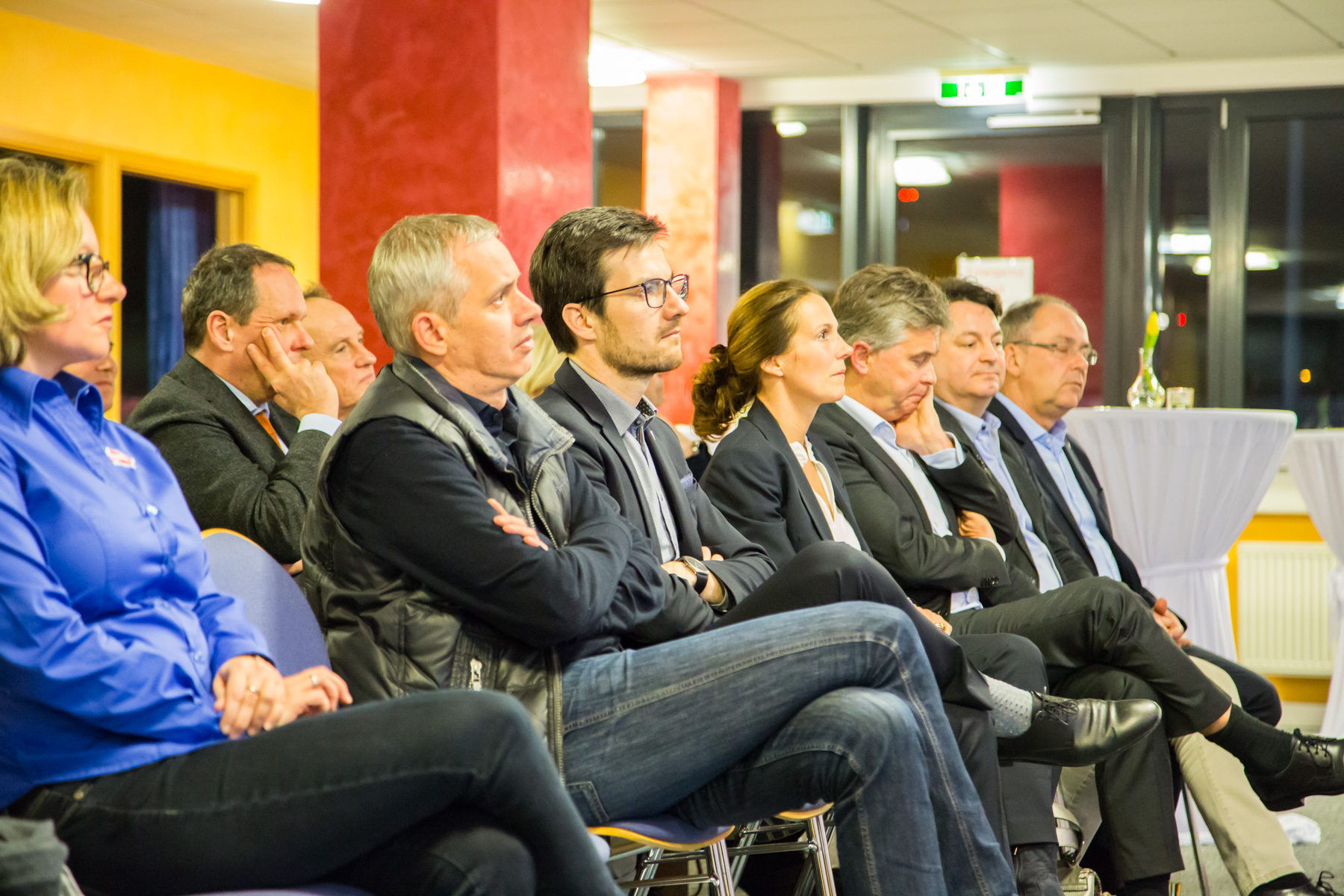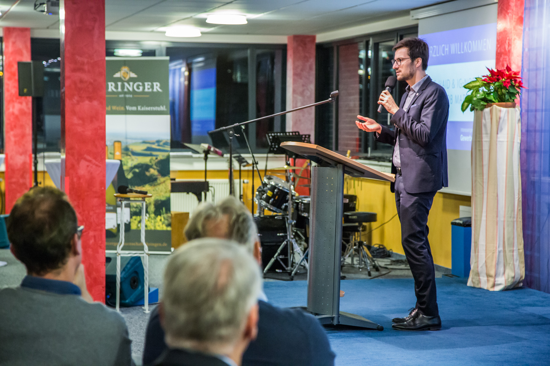 Nach der Begrüßung der Gäste durch den Unternehmer Christian Schulz und einer kurzen Vorstellung seines mit 115 Mitarbeitern aktiven Freiburger Unternehmens Extrol Mineralöle Schulz GmbH, umriss Martin Horn zunächst wichtige Eckpunkte seiner politischen Agenda für Freiburg und betonte, dass Wohnungs- und Sozialpolitik für ihn auch wirtschaftlich relevant seien. Industrie und Mittelstand seien prägend für die Stadt, daher brauche es – auch städtebaulich - Raum für deren Entwicklung. Horn betonte, wie sehr die Stadt auch vor diesem Hintergrund den neuen Stadtteil Dietenbach benötige, um auch künftig Fachkräften Platz für eine Wohnung bieten zu können. Dietenbach habe “die Mitte der Gesellschaft” als Bewohner im Blick, so der Oberbürgermeister, der bei der Veranstaltung von VAG-Vorstand Oliver Benz begleitet wurde, welcher den Unternehmern aktuelle Verbesserungen bei der ÖPNV-Anbindung im IG Nord darlegen konnte.