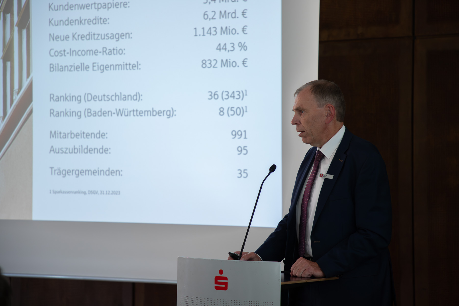 Herr Rigl präsentierte die Sparkasse Freiburg Nördlicher Breisgau als stark verankertes regionales Wirtschaftsunternehmen. Die Zahlen des Geschäftsjahres 2024 zeigen die wirtschaftliche Stärke der Sparkasse: