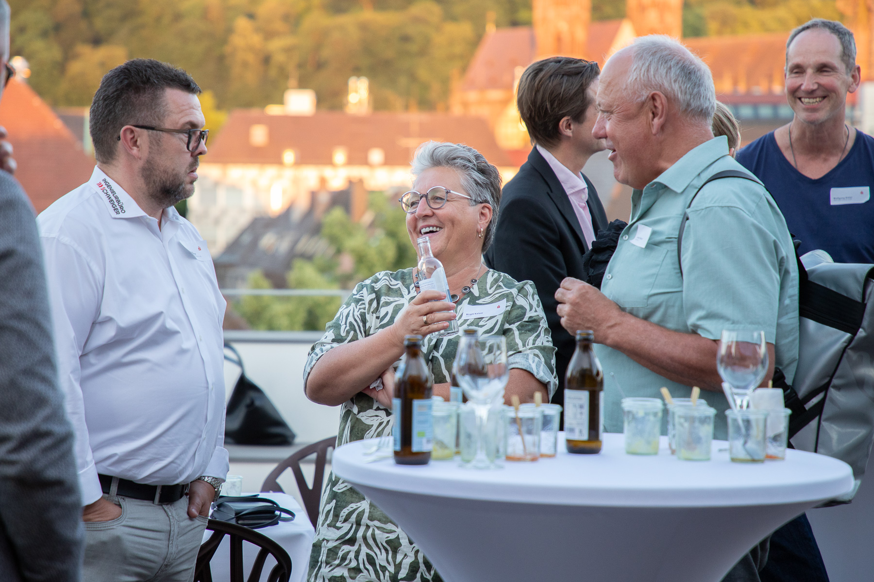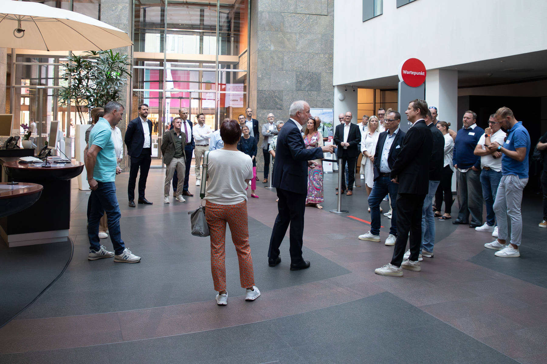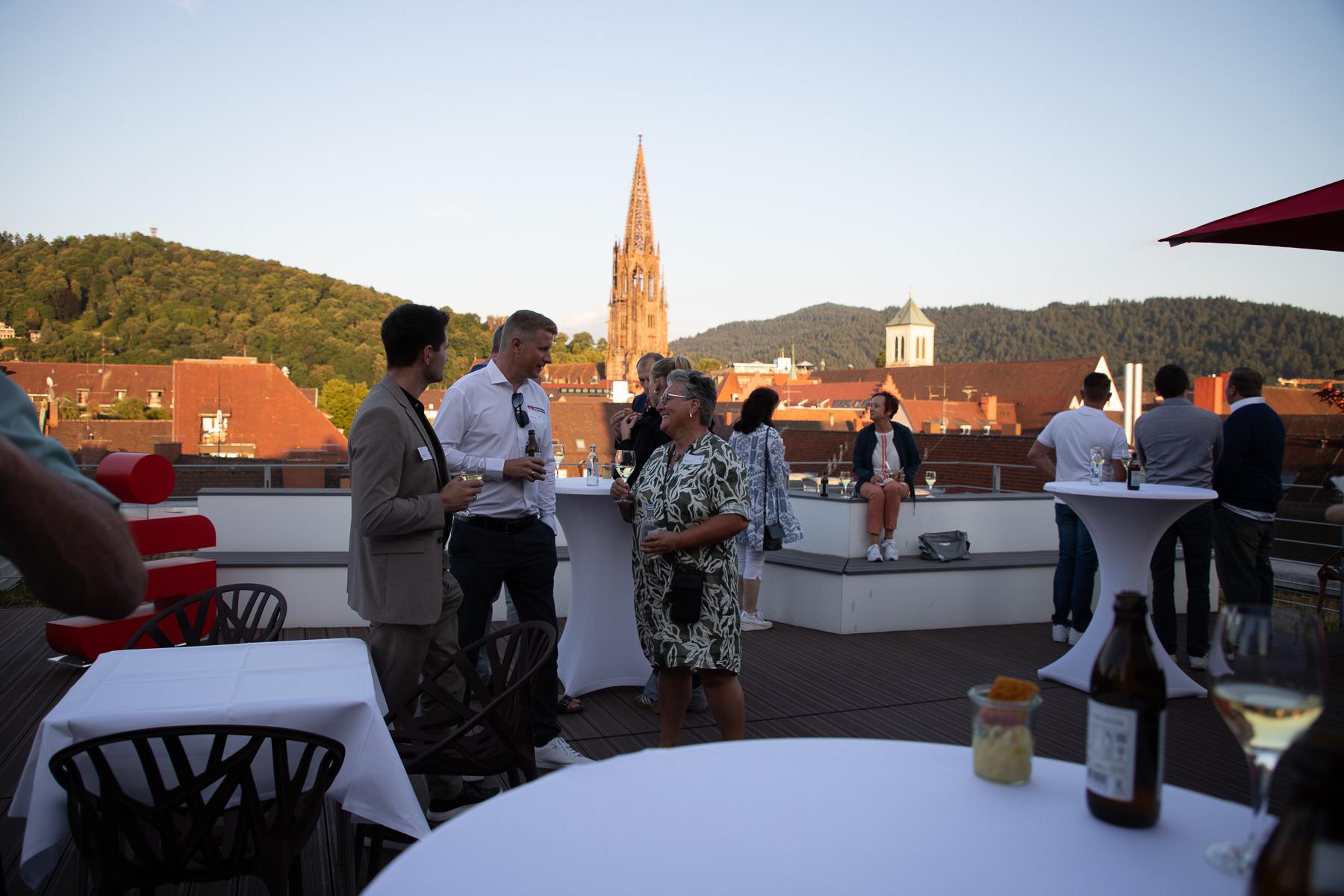 Nach einer kurzweiligen und sehr interessanten Führung durch die neue Vorstandsetage und weitere historisch bemerkenswerte Bereiche im denkmalgeschützten Bereich des eindrucksvollen Gebäudes wechselten wir auf die unvergessliche Dachterrasse mit Münsterblick. Der Abend klang bei köstlichen kleinen Leckereien und erlesenen regionalen Getränken aus, begleitet von anregenden Gesprächen und einem vielfältigen Austausch.