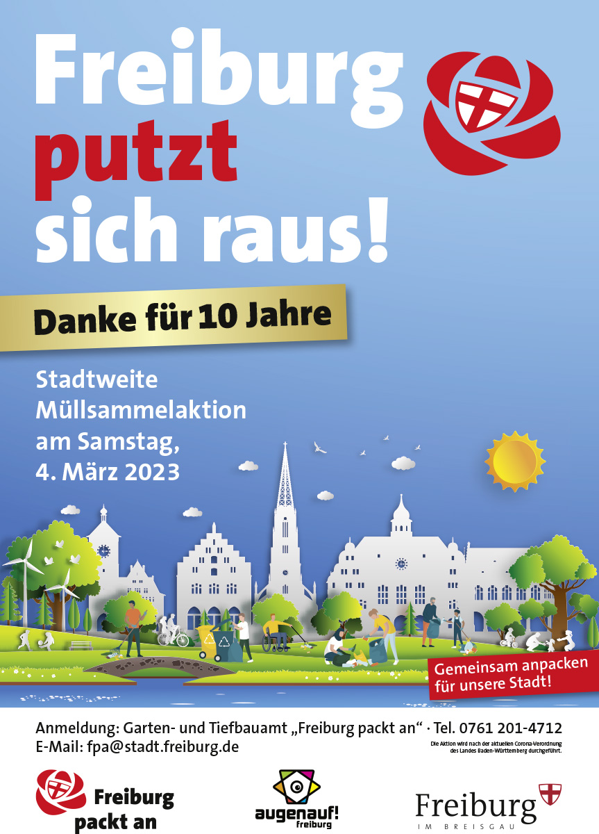 Alle interessierten Bürgerinnen und Bürger, Schulen, Vereine und Gruppen werden herzlich eingeladen, sich an der 10. stadtweiten Müllsammelaktion „Freiburg putzt sich raus“ zu beteiligen.